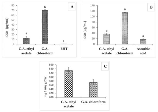 DPPH (A), ABTS (B) and FRAP (C) scavenging activity of ethyl acetate and chloroform extracts, BHT and Ascorbic acid of G. A. Abbreviations: FRAP, ferric reducing antioxidant power; DPPH, 2,2-diphenyl-1-picrylhydrazyl radical; ABTS, 2,2′-azino-bis (3-ethylbenzothiazoline-6-sulphonic) acid; IC50, Concentration of sample providing 50% inhibition.