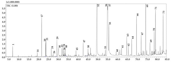 GC-MS profile of the n-hexane fraction of G.A. Main peaks are labeled. Peak assignment as in Table 3.
