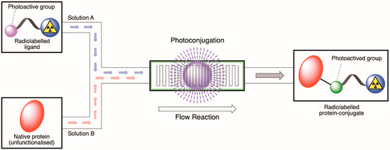 In the last decade, flow chemistry has been combined with radiochemistry to prepare a variety of radiotracers with different radionuclides, including 11C [8,9] and 18F [10,11,12,13]. Small reaction volumes, efficient mixing and reproducible control over all essential reaction parameters are some of the features that make microfluidic reactions attractive for radiochemistry. In 2016, Wright et al. [14] demonstrated the microfluidic radiolabelling of 89Zr-mAbs. In 2019, Poot et al. [15] reported proof-of-concept studies demonstrating that automated radiolabelling of 89Zr-mAbs in a batch reactor can also be combined with automated purification. However, both approaches relied on the use of pre-functionalised proteins bearing the DFO chelate. In contrast, we provide a proof-of-concept showing that flow-based photochemistry can be combined with radiochemistry to produce 89Zr-radiolabelled proteins direct from the unfunctionalised (native) protein source.