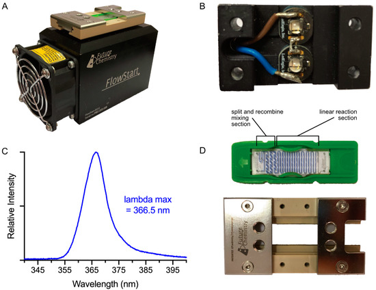(A) FutureChemistry FlowStart B-222 photochemistry module. (B) LedEngin, Inc twin LEDs connected in series. (C) Emission spectra for the twin LED light source (combined plots). (D) Microfluidic chip (top), oriented in the direction of flow (left to right); and microfluidic chip holder with standard ¼ inch-28 screw-connectors for input and output.