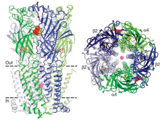Acetylcholine has two types of receptors, which are classified into nicotinic (nAChRs) and muscarinic (mAChRs) receptors [89,90,91]. Nicotinic receptors present as ion channels dependent on pentameric ligands that are activated by acetylcholine, as well as by nicotine to trigger action potentials for rapid synaptic neurotransmission [92]. In mammals, nicotinic receptors are expressed in presynaptic regulation to regulate the release of dopamine and other neurotransmitters from the nigrostriatal terminals. In insects, mainly in Drosophila melanogaster species, nicotinic receptors are expressed in abundance throughout the central nervous system [93,94,95,96]. Figure 1 demonstrates the structure of the nicotinic acetylcholine receptor [97]. The receptor is pentameric. The α4 subunits are green, and β2 is blue. Nicotine (red) and sodium (pink) are represented as spheres. The disulfide Cys-loop and C-loop connections are shown as yellow spheres.