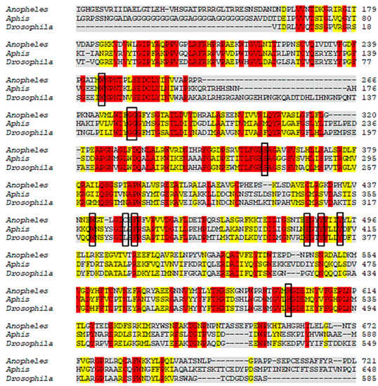 Alignment of Anopheles gambiae, Aphis gossypii, and Drosophila melanogaster Acetylcholinesterase (AChE) protein sequences. The gray regions represent non-similar and non-identical amino acids. The red regions represent identical amino acids. The yellow regions represent similar amino acids. The black boxes represent conserved regions of the active site which bind to the inhibitor.