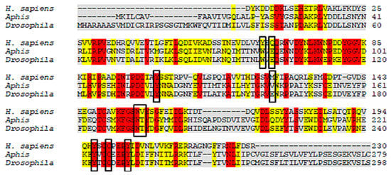 Alignment of H. sapiens, A. gossypii, and D. melanogaster nicotinic acetylcholine receptors (nAChRs) protein sequences. The gray regions represent non-similar and non-identical amino acids. The red regions represent identical amino acids. The yellow regions represent similar amino acids. The black boxes represent conserved regions of the active site which bind to the inhibitor.