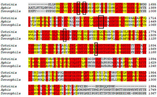Alignment of Ostrinia furnicalis, A. gossypii, and D. melanogaster Cht protein sequences. The gray regions represent non-similar and non-identical amino acids. The red regions represent identical amino acids. The yellow regions represent similar amino acids. The black boxes represent conserved regions of the active site which bind to the inhibitor.