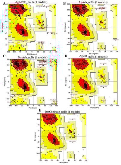 Ramachandran graphs of the homology models generated for A. gossypii and D. melanogaster enzymes. The colored regions represent the permitted and favored regions of the secondary structures and the white regions represent the prohibited regions. (A) A. Gossypii-AChE, (B) A. gossypii-nAChR, (C) D. melanogaster-nAChR, (D) A. gossypii-Cht (E), and D. melanogaster-Cht.