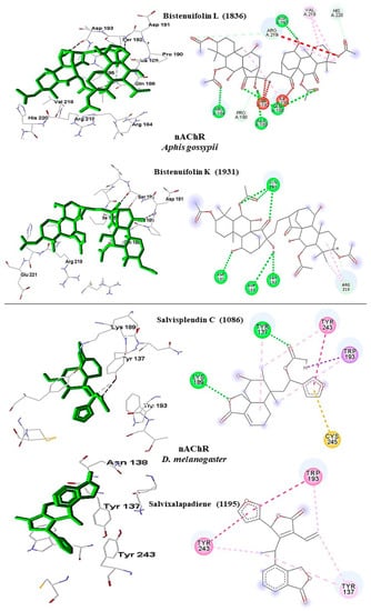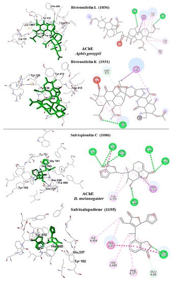 The molecular docking study was performed for the AChE, nAChR, and Cht enzymes of the species selected in this study. The diterpene bank was evaluated to select molecules with good probabilities of potential inactivation. The Molegro software generates compound interaction energies, producing a Moldock Score for each protein studied. Calculations were performed to identify the compounds presenting a higher probability of being potentially active for each protein analyzed, using the following formula: