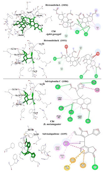 Background: The growing demand for agricultural products has led to the misuse/overuse of insecticides; resulting in the use of higher concentrations and the need for ever more toxic products. Ecologically, bioinsecticides are considered better and safer than synthetic insecticides; they must be toxic to the target organism, yet with low or no toxicity to non-target organisms. Many plant extracts have seen their high insecticide potential confirmed under laboratory conditions, and in the search for plant compounds with bioinsecticidal activity, the Lamiaceae family has yielded satisfactory results. Objective: The aim of our study was to develop computer-assisted predictions for compounds with known insecticidal activity against Aphis gossypii and Drosophila melanogaster. Results and conclusion: Structure analysis revealed ent-kaurane, kaurene, and clerodane diterpenes as the most active, showing excellent results. We also found that the interactions formed by these compounds were more stable, or presented similar stability to the commercialized insecticides tested. Overall, we concluded that the compounds bistenuifolin L (1836) and bistenuifolin K (1931), were potentially active against A. gossypii enzymes; and salvisplendin C (1086) and salvixalapadiene (1195), are potentially active against D. melanogaster. We observed and highlight that the diterpenes bistenuifolin L (1836), bistenuifolin K (1931), salvisplendin C (1086), and salvixalapadiene (1195), present a high probability of activity and low toxicity against the species studied.