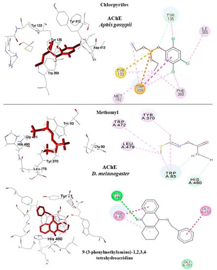 The enzyme AChE belongs to the group of phase I metabolic enzymes and can metabolize various internal and external substrates in pests; this group of metabolic enzymes consists of broad spectrum enzymes capable of metabolizing chemical insecticides such as organophosphates, carbamates, or pyrethroids [77,78]. Increasing or decreasing the amount of these enzymes leads to loss of efficiency in insecticides; thus, agents with new and different mechanisms of action must be developed for insect control [79,80,81,82].