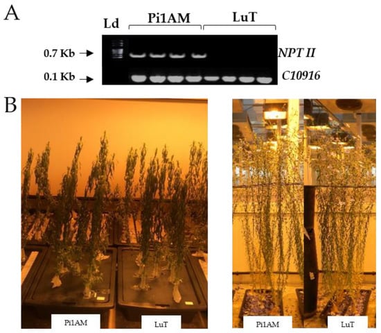 (A) Amplification of NPTII sequence from genomic DNA of wild-type (LuT) and transgenic plants transformed with pART-RNAiPLR binary vector (Pi1AM). PCR products obtained with a specific set of primers designed for the amplification of a 0.7 Kb NPTII fragment were separated by 2.0% agarose gel electrophoresis and visualized with GelRed, under UV light. Ld, a 100 pb DNA Ladder (Solis BioDyne). Flax housekeeping gene was used as a reference gene to normalize the PCR data. (B) Phenotypes of wild-type and transgenic plants under control conditions. Pictures were taken at 25 and 75 days after sowing (left and right respectively).