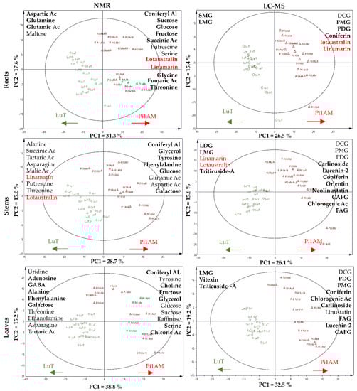 The LC-MS and NMR spectral data obtained for each plant part, were subjected separately to a multivariate non-targeted analysis-PLS-DA. The score plot of PLS-DA, shown in Figure 2, shows that transgenic LuPLR1-RNAi samples (Pi1AM) were grouped away from the wild-type samples, in various plant parts. These results highlight the metabolomic variability between LuT and Pi1AM. The next step to compare LuT and Pi1AM consisted of identifying the discriminant metabolites in each plant part.