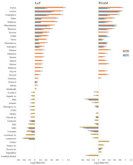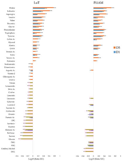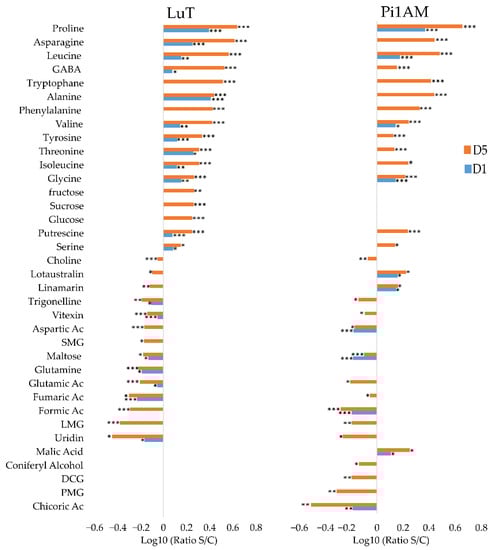 Comparison of metabolite content reorganization in wild-type (LuT) and transgenic (Pi1AM) leaves after osmotic stress at different time-points: one and five days. Bars on logarithmic scale (log10) represent the mean relative response ratio of S/C (content plant treated by PEG 6000/content control plant). Negative values represent a lower content and positive values a higher content of metabolites in stressed plants. Different time points are indicated by blue bars for D1 and red bars for D5. Values are significantly different at: *** p < 0.001; ** p < 0.01; * p < 0.05 after the Wilcoxon Rank Sum test (n = 8).