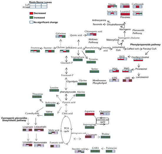 Major changes in the primary and secondary metabolic pathways of roots, stems and leaves of LuT and Pi1AM, after PEG treatment. The proposed metabolic pathways were based on the literature. Metabolites with red boxes represent significant decreases, with green ones represent significant increases, and with empty ones represent no significant change. The level of significance was set at p < 0.001, p < 0.01 and p < 0.05 after the Wilcoxon Rank Sum test.
