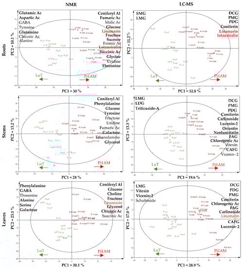 PLS-DA was performed with both NMR and LC-MS data corresponding to stressed samples for LuT and Pi1AM for each of the three parts of the plant (Figure 7). The representation reveals that, in roots, stems, and leaves, LuT and Pi1AM lines are still separated because they still have a different metabolome under osmotic stress conditions. The metabolites that discriminated LuT and Pi1AM under osmotic stress in each of the three organs of these two lines, are represented in Figure 7, and their respective ratios, and significance are reported in Table 1.