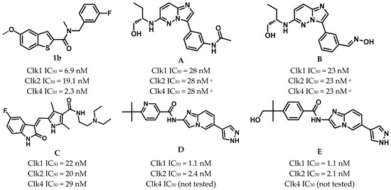 Potent Clk1 inhibitors described previously in the literature; 5-methoxybenzothiophene-2-carboxamide (1b) imidazo[1,2-b]pyridazines (A,B); Sunitinib (C); imidazo [1,2-a]pyridines (D,E). a No precise IC50s were provided; the authors stated that Clk2 and Clk4 were inhibited with potencies equal to that of Clk1.