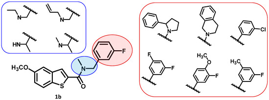 To improve the potency of the previous 5-methoxybenzothiophene-2-carboxamide (1b, Figure 2) and its selectivity over the most common off-targets for Clk1 inhibitors [13], various structural modifications were applied, which included modifications at the amide linker as well as introduction of various structural extensions at the amide function (summarized in Figure 2). These aimed at the stabilization of the biologically active conformation of the benzyl moiety for Clk1 inhibition. In addition, the conformationally constrained analogues were also planned in order to verify and possibly refine the previously proposed binding mode. In parallel, many new mono- and di-substituted benzyl extensions were included, taking advantage of the favorable effect of the fluorine substituent in 1b, while introducing additional groups for the interaction with the receptor but also for establishing intramolecular H-bonds (e.g., in 13a and 14a (Scheme 1), between the amide and the 2-methoxy substituent).