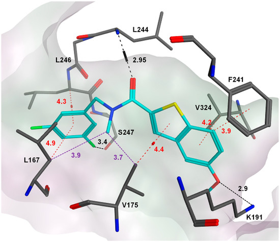 The predicted binding mode of compound 10b (cyan). 10b was docked in the ATP binding pocket of Clk1 (PDB code of the coordinates: 1Z57) using MOE. 10b was anchored inside the pocket through H-bonds (indicated in black) with Leu244, Lys191 as well as a weaker H-bond interaction between the fluorine and Ser247. In addition, CH-π interactions (red) were predicted between the benzyl moiety and Leu167/Leu264, as well as between the benzothiophene core and Val175/Val324. An edge-to-face CH-π interaction with Phe241 and hydrophobic interactions (violet) between the N-methyl, Leu167 and Val175 were also predicted. All interactions are indicated by dashed lines, and distances between the heavy atoms are given in Å.