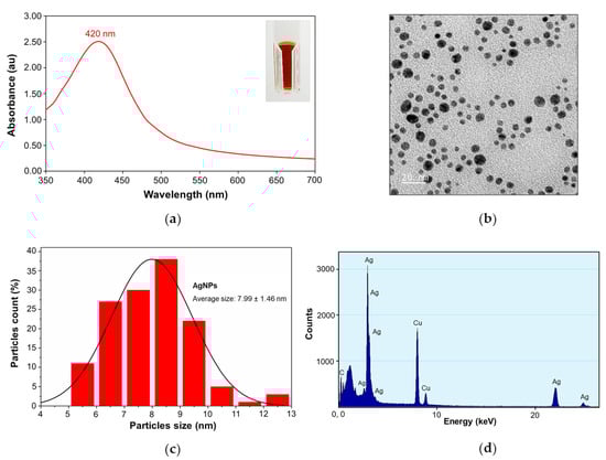 Tannic acid stabilized AgNPs (Tannin was used as both natural reducing agent and stabilizer) were provided by Prime Nanotechnology Co, Ltd. (Bangkok, Thailand). The concentration of AgNPs at 128 µg/mL was selected as the optimal concentration throughout characterization studies. The color of AgNPs colloids was dark yellow as shown in Figure 1a (inset). The UV-Vis spectrum showed a single peak of maximum absorption at 420 nm, corresponding to the surface plasmon resonance (SPR band) of AgNPs at room temperature (23.9 °C) (Figure 1a) [21]. A TEM micrograph exhibited that AgNPs were well monodispersed, as well as having a spherical shape (Figure 1b) with an average size of 7.99 ± 1.46 nm (n = 137) (Figure 1c). The energy dispersive X-ray (EDX) spectrum also confirmed the Ag metal composition of AgNPs as shown in Figure 1d, which has the characteristic peak of AgNPs at around 3 keV [22]. The peak of copper (Cu) was observed in the EDX spectrum due to elemental copper (Cu) that was attributed to the carbon-supported copper grid used for sample preparation.
