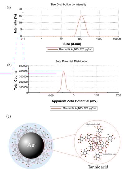The AgNPs colloidal solutions with pH value of 5.94 were measured. Silver nanoparticles (AgNPs) had average hydrodynamic diameters of 101.13 ± 0.85 nm with low polydispersity index (PDI) value (0.20 ± 0.01 nm), indicating high particle homogeneity [23] (Figure 2a) and the zeta potential value of -47.63 ± 5.79 mV revealed the stability and negatively charge of AgNPs [24] (Figure 2b). This zeta potential value indicated that tannic acid contributed to the negative charge distribution. This distribution produced electrostatically stabilized AgNP surfaces as shown in Figure 2c, which illustrates the simple structural model of AgNPs stabilized with tannic acid [25].
