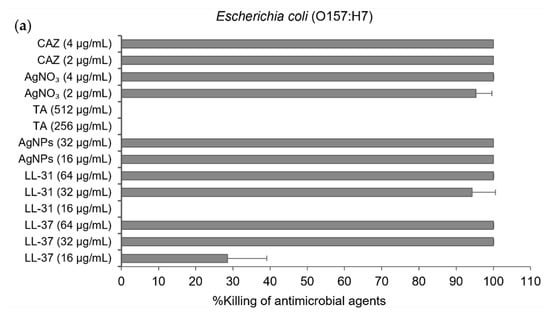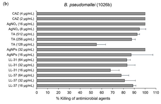 % killing of antibacterial agents, LL-37, LL-31, and AgNPs. CAZ, AgNO₃ and tannic acid (TA) were used as the positive control): (a) against Escherichia coli (O157: H7); (b) and B. pseudomallei (1026b). Data are represented as mean and standard deviation of two independent experiments performed in triplicate (n = 6). % killing was calculated from [1−(CFUsample/CFUcontrol)] × 100%.