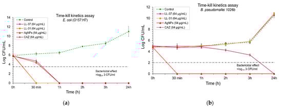 To determine the bactericidal activity of antibacterial agents over time, a time-kill kinetics assay was performed. Bacterial suspensions were incubated with each antibacterial agent at the final concentration of 64 µg/mL at the time points of 0, 0.5, 1, 2, 3, and 24 h. The results show that LL-37 and LL-31 exhibited a rapid bactericidal effect against E. coli within 30 min, whereas AgNPs and ceftazidime (as a positive control) could kill E. coli within 1 h (Figure 4a). To determine these time-kill kinetics assay against B. pseudomallei, the results showed that AgNPs could kill B. pseudomallei strongly within 30 min, whereas ceftazidime could slowly kill this pathogenic bacterium within 24 h. On the other hand, both LL-37 and LL-31 at a concentration of 64 µg/mL could not inhibit B. pseudomallei at all (Figure 4b).