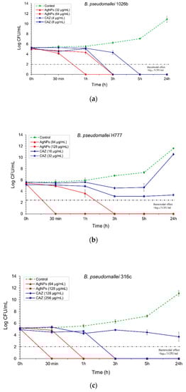 Time-kill kinetics assay of AgNPs and CAZ: (a) against B. pseudomallei (1026b); (b) H777; (c) and 316c. The bacterial suspension was performed at the time points of 0, 0.5, 1, 3, 5 and 24 h. The bactericidal effect was defined as ≥3 log₁₀ reductions in the colony-forming unit (CFU/mL), compared with untreated control. Data are represented as mean value ± SD (error bar) from two independent experiments carried out in triplicate (n = 6).