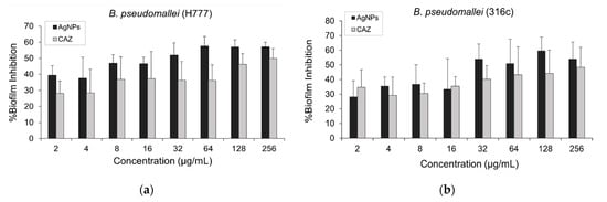 The effect of AgNPs on the inhibition of established biofilm against CAZ-resistant strains of B. pseudomallei (H777 and 316c) was performed by crystal violet assay. From the results as shown in Figure 6a,b, AgNPs showed an increasing trend of % biofilm inhibition against both strains when the concentration was increased. We found that at least 32 µg/mL of AgNPs exhibited biofilm inhibition >50% against both CAZ-resistant strains.