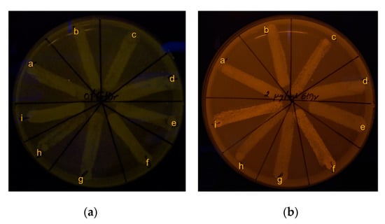 To detect the efflux pump activity, cartwheel assay was carried out. Zero % of Ethidium bromide (EtBr) agar was used as control (Figure 7a). The results showed no fluorescence emission of bacteria on 2 µg/mL EtBr agar. This result indicates that three different strains of B. pseudomallei before and after the 30th generation passage had efflux pump activity to pump EtBr (as an efflux pump substrate) out of the cells [26] (Figure 7b).