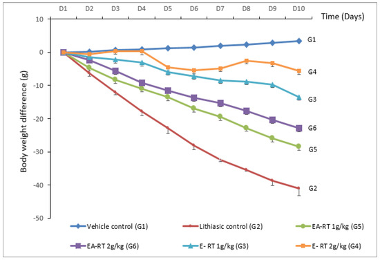 The mean body weights (MBW) of the six experimental groups (i.e., vehicle control (G1), lithiasic control (G2), E-RT 1 g/kg (G3), E-RT 2 g/kg (G4), EA-RT 1 g/kg (G5), EA-RT 2 g/kg (G6)) were similar at the beginning of the experiment (day 1). After 10 days of treatment, the MBW of five groups (G2, G3, G4, G5 and G6) were decreased when compared to (G1) (Figure 1). Figure 1 also shows that the group G2 (i.e., −41.08 g) had a greater decrease in MBW than the RT-treated groups (G3, G4, G5 and G6) (i.e., −13.52 g; −5.68 g; −28.53 g; −22.96 g, respectively) and that the MBW of the group treated with E-RT (1 and 2 g/kg) did not significantly differ from the untreated control G1.