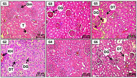 Representative microscopic images of hematoxylin-and-eosin-stained kidney sections observed under a light microscope from rats of: the vehicle control (G1), the lithiasic control (G2), treated with E-RT at 1 g/kg (G3) and 2 g/kg (G4), treated with EA-RT at 1 g/kg (G5) and 2 g/kg (G6). Gm: Glomeruli, T: Tubular, DG: Dilatation of glomeruli, DT: Dilatation of tubular, KH: kidney hemorrhage.