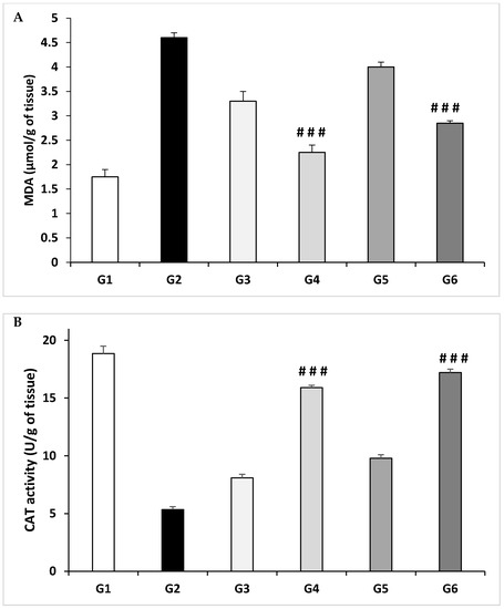 In vivo, the antioxidant activity was evaluated in kidney homogenates using lipid peroxidation determination; malondialdehyde (MDA) concentration and catalase (CAT) activity (Figure 3).