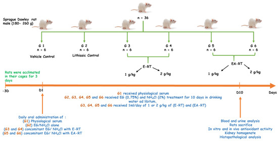 - G3 and G4 received distilled water supplemented with 0.75% ethylene glycol (EG) and 2% ammonium chloride (AC) and concomitantly, 1 mL/day of 1 or 2 g/kg of ethanolic extract of RT (E-RT), dissolved in distilled water, respectively, during the ten days.