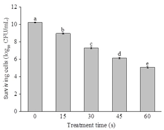The disinfection efficacy of SAEW against P. deceptionensis CM2 is presented in Figure 1. The pH, oxidation reduction potential (ORP), and available chlorine concentration (ACC) of SAEW were 5.9, 945 mV, and 64 mg/L, respectively. As shown in Figure 1, the bactericidal efficiency of SAEW against P. deceptionensis CM2 was enhanced significantly with an increased treatment time (p < 0.05). The initial populations of P. deceptionensis CM2 cells were 10.2 log10 CFU/mL. After SAEW treatment for 15, 30, 45, and 60 s, the populations of P. deceptionensis CM2 decreased by 1.26, 2.91, 4.08, and 5.14 log10 CFU/mL (p < 0.05), respectively. Zeng et al. [17] reported that Staphylococcus. aureus cells were inactivated by 3.73 log10 CFU/mL following 1 min treatment of EW (pH 2.3–2.7, 30.73 mg/L of ACC). It should be pointed out that microorganisms exhibit obvious differences in sensitivity to EW. As reported by Fenner et al. [18], Proteus mirabilis and S. aureus were more sensitive than Mycobacterium avium subsp. avium, Enterococcus faecium, and Pseudomona saeruginosa toward EW. Park et al. [19] also found that Bacillus cereus vegetative cells were much more sensitive to the combined treatments of EW and citric acid than spores. Therefore, more attention should be paid to the difference in sensitivity of microorganisms to EW when EW is used in food preservation. Kang et al. [20] found that plasma-activated water could effectively inactivate P. deceptionensis CM2 on chicken breasts, resulting in slight changes to the sensory qualities. Therefore, future studies are necessary to evaluate the antibacterial efficacy of SAEW for meat products.