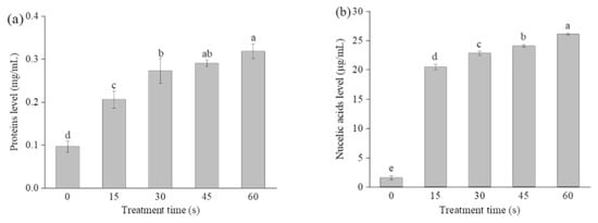 Leakages of intracellular proteins (a) and nucleic acids (b) changing with SAEW treatment in P. deceptionensis CM2 cells. Different letters above the bars indicate a statistically significant difference (LSD test, p < 0.05).