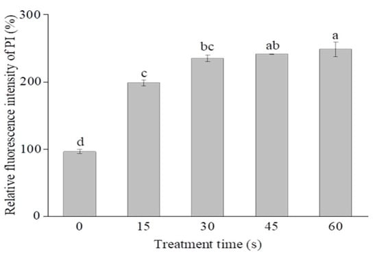 Cytoplasmic membranes are the key components to maintain the cell architecture and to respond to environmental stresses [27,28]. As a fluorescence probe, propidium iodide (PI) can only enter cells with injured cytoplasmic membranes, where it binds to nucleic acids and produces red fluorescence [29]. As shown in Figure 4, the relative PI fluorescence intensity of SAEW-treated cells significantly increased compared to the control (p < 0.05). After SAEW treatment for 15, 30, 45, and 60 s, the PI fluorescence intensity of P. deceptionensis CM2 was significantly increased by 102.1%, 138.6%, 145%, and 152.1% (p < 0.05), respectively. Similar findings were also reported by Ye et al. [30], who found that SAEW-treated E. coli cells exhibited higher PI fluorescence intensities than the untreated control cells. As shown in Figure 5, the number of cells with red fluorescence significantly increased with the extension of EW treatment time. In general, these findings suggest that the damage of cytoplasmic membranes may be responsible for the microbial inactivation caused by EW [31].