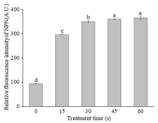 For Gram-negative bacteria, the outer membrane (OM) plays an important role in the rapid adaptation to various environmental stresses such as heat, acid, and antibiotics [32]. In this work, the n-phenyl-1-napthylamine (NPN) access assay was applied to assess the influences of SAEW on the OM permeabilization of P. deceptionensis CM2 cells. NPN is a neutral hydrophobic fluorescent probe, exhibiting low fluorescence quantum yield in an aqueous environment, but becomes strongly fluorescent in nonpolar or hydrophobic environments. Therefore, NPN is widely used to assess the damage of the outer membrane of Gram-negative bacteria [33]. As shown in Figure 6, SAEW treatment caused an increase in the NPN fluorescence intensity of P. deceptionensis CM2 cells. After being treated by SAEW for 15, 30, 45, and 60 s, the NPN fluorescence intensity of P. deceptionensis CM2 cells was increased by 202%, 255%, 266%, and 271%, respectively, compared to the untreated cells (p < 0.05). These data indicate that SAEW disrupted the extracellular membranes of P. deceptionensis CM2 cells, which might contribute to the cell death [34]. Previous studies showed that AEW with high ORP caused the oxidation of sulfhydryl groups on cell surfaces and disturbed metabolic pathways inside the bacterial cells, which might be responsible for cell death [35,36]. In addition, active chlorine forms (Cl2, HOCl, and OCl−) are the main crucial substances for the damage to outer membrane [37].