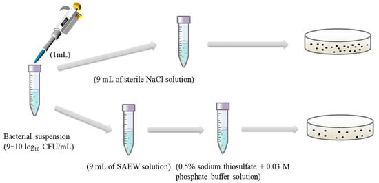 The antimicrobial test of SAEW was performed by the method described previously [38]. Briefly, 1 mL of bacterial solution was incubated with 9 mL of SAEW for 0, 15, 30, 45, and 60 s at room temperature, respectively. Thereafter, 1 mL of the cell suspension was diluted with 9 mL of sterile neutralizing buffer solution (0.5% sodium thiosulfate + 0.03 mmol/L phosphate buffer solution (PBS, pH 7.2–7.4)). Then, 0.1 mL of diluted cells suspension was spread on plate count agar media (Beijing Land Bridge Technology Co., Ltd., Beijing, China), and then the plates were incubated at 25 °C for 24 h (Figure 7). Finally, the number of colonies developed on the plates was determined and the results expressed as log10 CFU/mL.