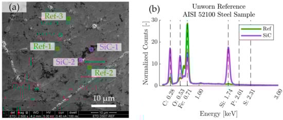 SEM-EDS characterization of reference AISI 52100 steel sample. (a) SEM image showing locations of analyzed regions of interest, consisting of three reference regions (Ref-1–3) and two regions rich in silicon-carbon (SiC-1–2). (b) Average EDS spectra corresponding to the Ref and SiC regions of interest.