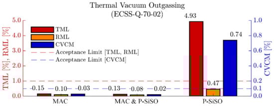 Thermal vacuum (125 °C and <10−3 Pa) outgassing test for screening of space materials, in accordance to standard ECSS-Q-70-02. The outgassing performance in terms of total mass loss (TML), relative mass loss (RML), and collected volatiles condensable material (CVCM) is within the acceptance limits for neat MAC, and MAC with 0.4 wt% P-SiSO (MAC and P-SISO). Neat P-SiSO display TML and CVCM outside the acceptance limit, while RML is acceptable.