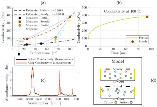 Conductivity analysis of ‘MAC &P-SiSO’, containing 0.4 wt% P-SiSO in MAC. (a) Conductivity measured sequentially from 25 °C to 100 °C in increments of 25 °C, before cooling down to 25 °C. Dashed lines represent ASTM D2624 temperature-conductivity relations estimated for initial and steady state. (b) Detailed view of initial 100 min of conductivity measurement at 100 °C shows time-dependency of conductivity. (c) Fourier transform infrared spectroscopy (FTIR) analysis before first and after last conductivity measurements confirm chemical stability. (d) Schematic illustration to explain the observed time-dependency of conductivity.