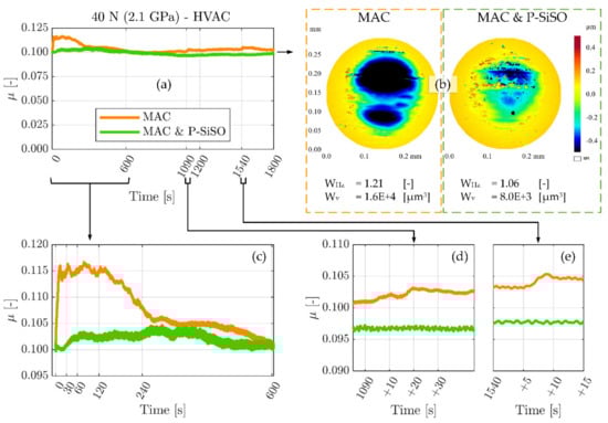 As seen in Figure 4a, and magnified in Figure 4c, the neat MAC displays a pronounced running-in behavior with a rapidly rising friction in the initial 10 s. A significantly increased friction coefficient is maintained during the initial 4 min (240 s) before stabilizing around the initial value. It is deemed likely that higher friction during the running-in phase was accompanied by significant wear. In contrast, ‘MAC &P-SiSO’ display a relatively steady running-in process, with a very slight increase in friction from 30–60 s into the experiment. However, also with ‘MAC &P-SiSO’ there was a running-in process over the initial ~500 s. In the case of ‘MAC &P-SiSO’, the friction coefficient remains low, but the running-in process is accompanied by slight fluctuations in friction before the friction stabilizes. The 3DP data reported in Figure 4b display wear indices (WHz) of 1.21 for neat MAC, and 1.05 for ‘MAC &P-SiSO’. The removed volume of material (Wv) was twice as large in the sample lubricated by neat MAC as compared to ‘MAC &P-SiSO’. It is likely that a significant part of the wear seen with MAC was produced during the running-in phase, as indicated by the significantly higher friction. After such a period of high wear, the load-bearing contact area increases, which in turn lowers the actual contact pressure throughout the remaining test.