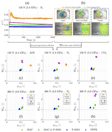 (a) Friction traces recorded for neat MAC, ‘MAC &P-SiSO’, neat P-SiSO, and neat PFPE at conditions of {150 N/2.4 GPa/N2}. (b) Pairs of ball and disc wear scars for neat MAC, ‘MAC &P-SiSO’, and neat P-SiSO, as seen with optical 3D-profilometer (3DP). Color-coded topography data is overlaid on intensity charts to provide representative images of the morphology and severity of wear encountered on both ball (upper part of image) and disc (lower part). (c–h) Average wear index (WHz) plotted against the average friction coefficient (µavg) at 150 and 300 N load in AIR, N2, and CO2 atmospheres.