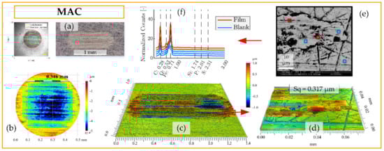 Figure 6 include surface analysis of neat MAC by LOM, 3DP, and SEM-EDS. When studying the worn disc surface lubricated by neat MAC under LOM, as seen in Figure 6a, there is no indication of boundary film present. The surface appears brighter than the surrounding unworn material, which is indicative of nascent steel exposed by severe wear. The ball wear scar image seen to the left in Figure 6a was produced by 3DP in intensity mode, and the dark appearance of the wear scar is in this case an effect of reduced reflection caused by the significant roughness of the surface. Figure 6b shows a detailed view of the ball topography measured by 3DP. The ball curvature has been subtracted from the data in order to discern the depth of wear on the ball (~5 µm). It is clear that most of the wear is located at the center of the ball, where the contact pressure is highest. This result is in line with the well-established Archard wear model, which predicts that wear is proportional to load [111] and, therefore, wear depth should correspond to the pressure distribution. The disc topography measured by 3DP is seen in Figure 6c–d at low and high magnification. It can be clearly seen that lubrication by neat MAC under the conditions {150 N/2.4 GPa/AIR} produces a rough surface that appears severely abraded. The detailed view in Figure 6d show that there is a significant amount of adhered material on the disc surface, leading to a high area roughness (Sq = 0.317 µm). Figure 6e show the same region by SEM, with five locations (approximately 1 × 1 µm) selected for EDS analysis. The EDS-analyzed regions were selected to search for evidence of chemical reactions, although in the case of neat MAC in AIR, no boundary film was expected. As seen in Figure 6f, the detected energy peaks (normalized counts) are associated with carbon, oxygen, and iron, and there is no significant difference compared to the unworn reference shown in Figure 1. Also, there is no significant difference between the regions marked ‘Film’ or ‘Blank’ (plotted signals are shifted vertically by 4 units to improve visibility).
