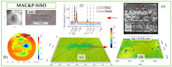 The boundary film formed by the lubricant consisting of 0.4 wt% P-SiSO in MAC, ‘MAC &P-SiSO’, is analyzed in Figure 7. When studying the worn surfaces under LOM, they appear covered in blue, purple and black patches, indicative of boundary film. The detailed 3DP-view of the ball wear scar topography shown in Figure 7b indicate that the central load carrying region of the ball has been well protected, in contrast to the surface lubricated with neat MAC seen in Figure 6b. Clearly, the wear mechanism when lubricated with ‘MAC &P-SiSO’ no longer follows the simple relation of wear rate proportional to load as described by the Archard wear model. From Figure 7c–d, it is clear that the disc surface has experienced little wear, and the roughness was actually slightly reduced within the wear scar (Sq = 0.102 µm) compared to the unworn surface outside the wear scar (Sq = 0.116 µm). The SEM-EDS analysis in Figure 7e–f indicates a boundary film composed mainly of silicate, which is in line with results seen in previous work [96,97].