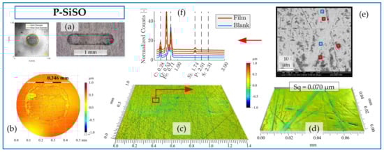The analysis of the boundary film formed by neat P-SiSO is shown in Figure 8. The visual appearance of the disc wear scar as seen by LOM in Figure 8a indicates the presence of boundary film. In comparison to ‘MAC &P-SiSO’, the boundary film formed by neat P-SiSO produced a darker appearance when observed by LOM. The topographical analysis by 3DP shows barely detectable wear along the edge of the ball wear scar, seen in Figure 8b, and insignificant wear on the disc as seen in Figure 8c. In the case of neat P-SiSO, the surface roughness within the worn region of the disc was significantly reduced (~40%) in comparison to the unworn region (Sq = 0.116 µm). The valleys seen in Figure 8d are attributed to the original surface texture, and were not affected by wear and, consequently, the reduction in surface roughness can be attributed to the removal of peaks. As shown in the SEM image Figure 8e, the boundary film was only formed on peaks, and no film was observed in the valley region. EDS analysis in Figure 8f indicates that the boundary film is composed of silicate, similar to the boundary film observed in the case of ‘MAC &P-SiSO’ and again in line with previous studies [96,97].