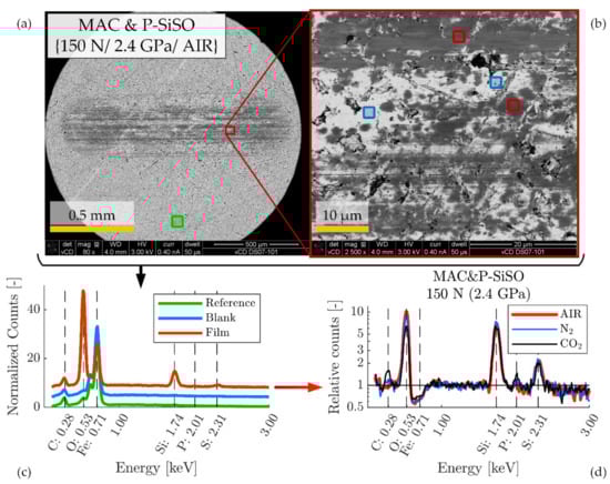 The tribological performance was clearly affected by the atmospheric conditions, as shown in Figure 5 In order to study the effect of atmospheric conditions on the boundary film formation, surface analysis by the complementary technique described in Figure 6, Figure 7 and Figure 8 was applied and further extended. Figure 9 shows the principle of the extended analysis for ‘MAC &P-SiSO’ under 150 N load conditions. The analyzed region can be seen in Figure 9a–b, with the corresponding EDS spectra in Figure 9c. Each EDS-signal is normalized against the average background radiation as described previously, and the curves are shifted in the vertical scale by 4 units in order to distinguish the separate spectra. Figure 9d is produced by dividing the Film spectra retrieved under different atmospheres with the reference spectrum. The relative counts (divided by the reference and shown in log-scale) shows the detected X-ray photons over the energy spectra covering the elements of interest in the boundary films that were produced. For each condition (AIR, N2, CO2), several film regions were analyzed and combined in order to produce representative signals of the relative counts over the energy spectrum observed in the boundary film. As can be seen in Figure 9d, the composition of the boundary film appears to be insensitive to the atmospheric conditions in the case of ‘MAC &P-SiSO’ under these conditions.