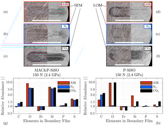 Boundary film analysis of SRV-3 steel discs. (a–f) Complementary microscopic techniques (left part light optical microscopy (LOM) and right part SEM) indicate the boundary films coverage in the wear scars lubricated with ‘MAC &P-SiSO’ (a–c) and neat P-SiSO (d–e) under conditions {150 N/2.4 GPa/AIR}, {150 N/2.4 GPa/N2}, {150 N/2.4 GPa/CO2}. (g–h) Relative abundance (in relation to unworn Reference) of elements detected in the boundary films when lubricated with ‘MAC &P-SiSO’ (g) or neat P-SiSO (h).