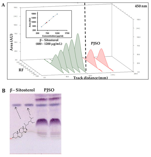 Standard β-sitosterol at different concentrations and known volumes of PSJO was spotted on aluminum-backed silica gel 60 F254 plates (Merck Millipore KGaA, Darmstadt, Germany). Chloroform:methanol (9:1) was used as a mobile phase and anisaldehyde sulfuric acid reagent was used for derivatization. Quantitation was by densitometry after scanning the derivatized samples at 450 nm. The concentration of β-sitosterol in the sample was estimated against a linearity curve from duplicate loadings.