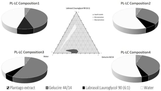 To obtain the optimal concentration range of components for the boundary of liquid crystals, the pseudoternary phase diagram was constructed using the water dilution method [15]. According to the toxicity screening evaluation, Labrasol, Lauroglycol 90, and Gelucire 44/14 were selected as surfactants. First, the required amount of Plantago lanceolata extract (equal to 5% for each composition) was dissolved in the mixture of the surfactants. Then, water was added to the system under moderate stirring. The water content of the compositions varied from 37% to 56%, while the ratio of Labrasol/Lauroglycol 90 was constant (6:1). Four different formulations were selected for further investigation according to the pseudoternary phase diagram (Table 1).