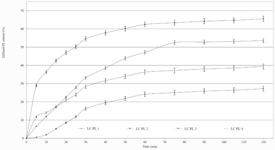 The dissolution rate of Plantago lanceolata extract from the formulated LC systems (PL-LC compositions I–IV) was evaluated using a vertical Franz diffusion chamber apparatus (Hanson Microette TM Topical and Transdermal Diffusion Cell System) in triplicate [32]. Samples were applied as the donor phase on a synthetic cellulose acetate membrane previously soaked in isopropyl myristate [33]. We used 30% (v/v) alcohol as the receptor phase and samples were stirred with a magnetic rotor at 350 rpm to enhance the dissolution rate of PL extract. The receptor solution was thermostated at 32 °C during the entire experiment to imitate the temperature of physiological skin on the Franz cell membrane. Samples of 1.0 mL of the receptor medium were sequentially collected at predetermined time points (every 15 min for 6 h) and replaced with fresh receptor solution after each sampling. Drug content was analyzed using a UV–Vis spectrophotometer (Shimadzu, Tokyo, Japan) at a wavelength of 517 nm. A calibration curve was determined before the spectroscopic measurements.