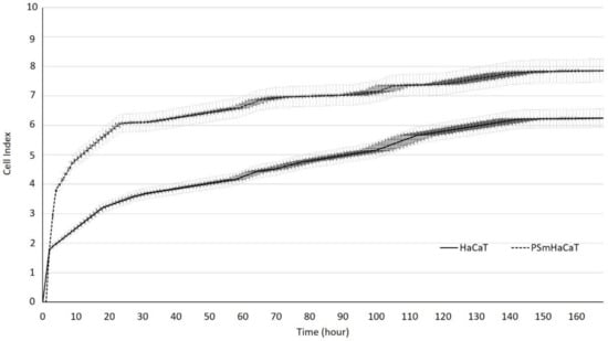 Impedance-based determination of HaCaT cell proliferation. Each data point represents the mean ± SD, n = 10.